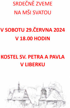 29. červen je slavností apoštolů sv. Petra a Pavla, kterým je zasvěcený liberský kostel. U této příležitosti proto proběhne v sobotu 29. června v 18 hodin mše svatá, na kterou Vás tímto srdečně zveme.