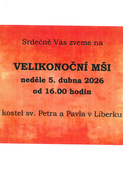 Jarní krajina už se pomalu probouzí a blíží se velikonoční čas. My Vás i letos srdečně zveme na Velikonoční mši, která se uskuteční v neděli 5. dubna od 16 hodin v našem liberském kostelíku. Přijměte naše pozvání a prožijte čas jarní i sváteční společně s námi! Těšíme se na Vás!